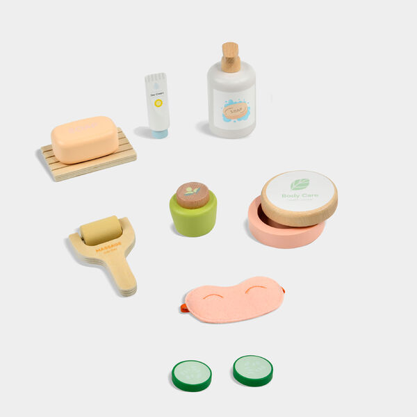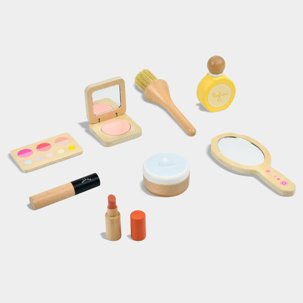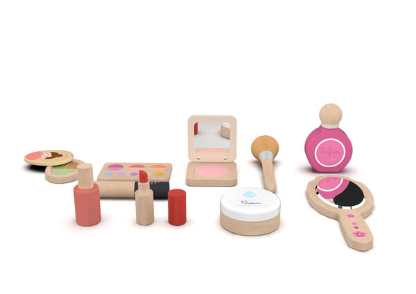 Ensemble d'accessoires d'imitation en bois pour se maquiller. Ce kit comprend : Un phare à paupières naturelles, un set de phares à paupières colorés, un blush en poudre, un pinceau, un mascara, un vernis à ongle, un rouge à lèvre rouge, une crème hydratante, un parfum de Paris et un miroir pour s'admirer pendant des heures !