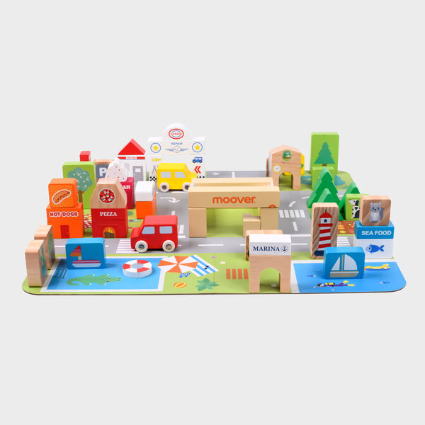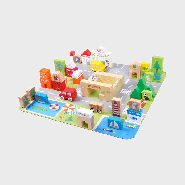 With over 60 wooden pieces, including buildings, shops, mini cars, roads, trees, animals, children can design and build their own bustling cityscapes. This educational set encourages counting, sorting, spelling, shape recognition, and imaginative storytelling.
